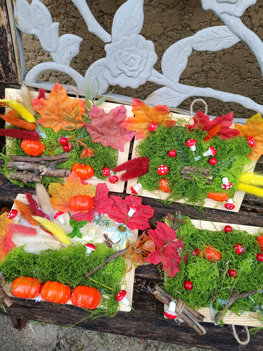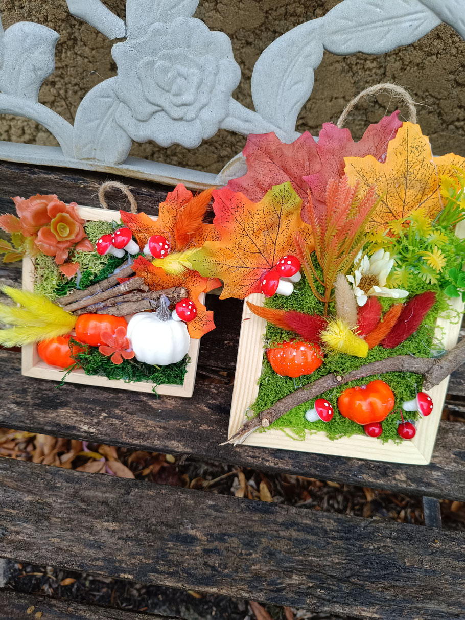 cadres en bois de 12cm, décorations diverses, végétaux factices de toutes saisons, fleurs artificielles, tout est fourni.